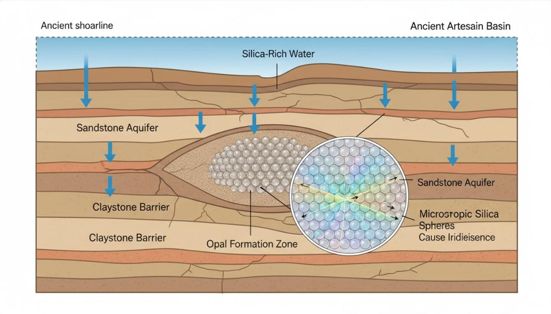 Around 100 million years ago, the Great Artesian Basin covered much of central Australia with a vast inland sea As the sea evaporated, silica-rich water percolated through sandstone layers, filling cracks and voids microscopic silica spheres arranged in a precise grid, creating the unique structure that produces opal's famous color play.